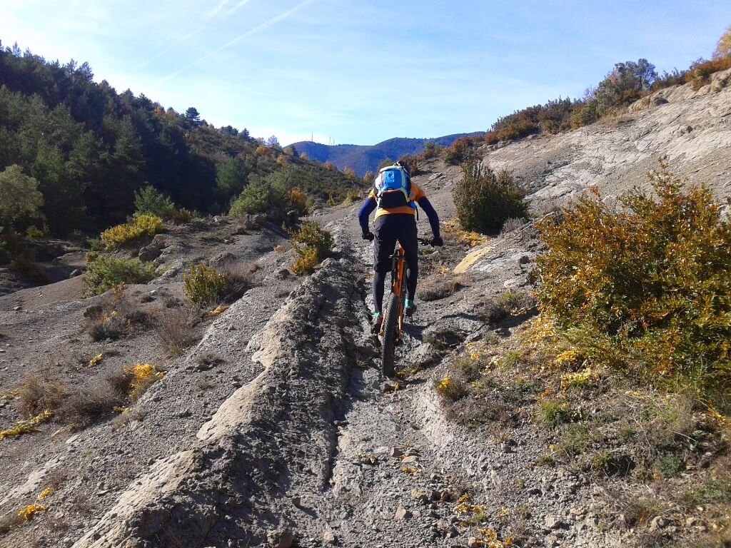 La de hoy es una etapa más suave que el resto de la Prepirenaica All Mountain, disfruta del viaje. La etapa parte de Nocito y remonta por carretera hacia Cuello Baíl, que separa el valle de Nocito y el valle del río Guarga. Allí arranca una pista que pasa junto al Dolmen de Ibirque, lugar para la primera foto del día. Desde ese punto, la pista sigue con un continuo sube y baja, cabalgando a los lomos de la Sierra de Belarra con el Pirineo a la derecha y los valles de Nocito y Belsué a la izquierda. El recorrido pasa muy cerca del despoblado de Ibirque, otro lugar mágico que bien merece una visita. A los amantes del enduro atención a la variante por sendero que os proponemos, un tramo de deliciosos 5 km por sendero pasando por el despoblado Ibirque y llegando a la Pardina Usieto, tras un divertido tramo de bajada y un remonte pedaleo hasta el entorno de la Pardina.