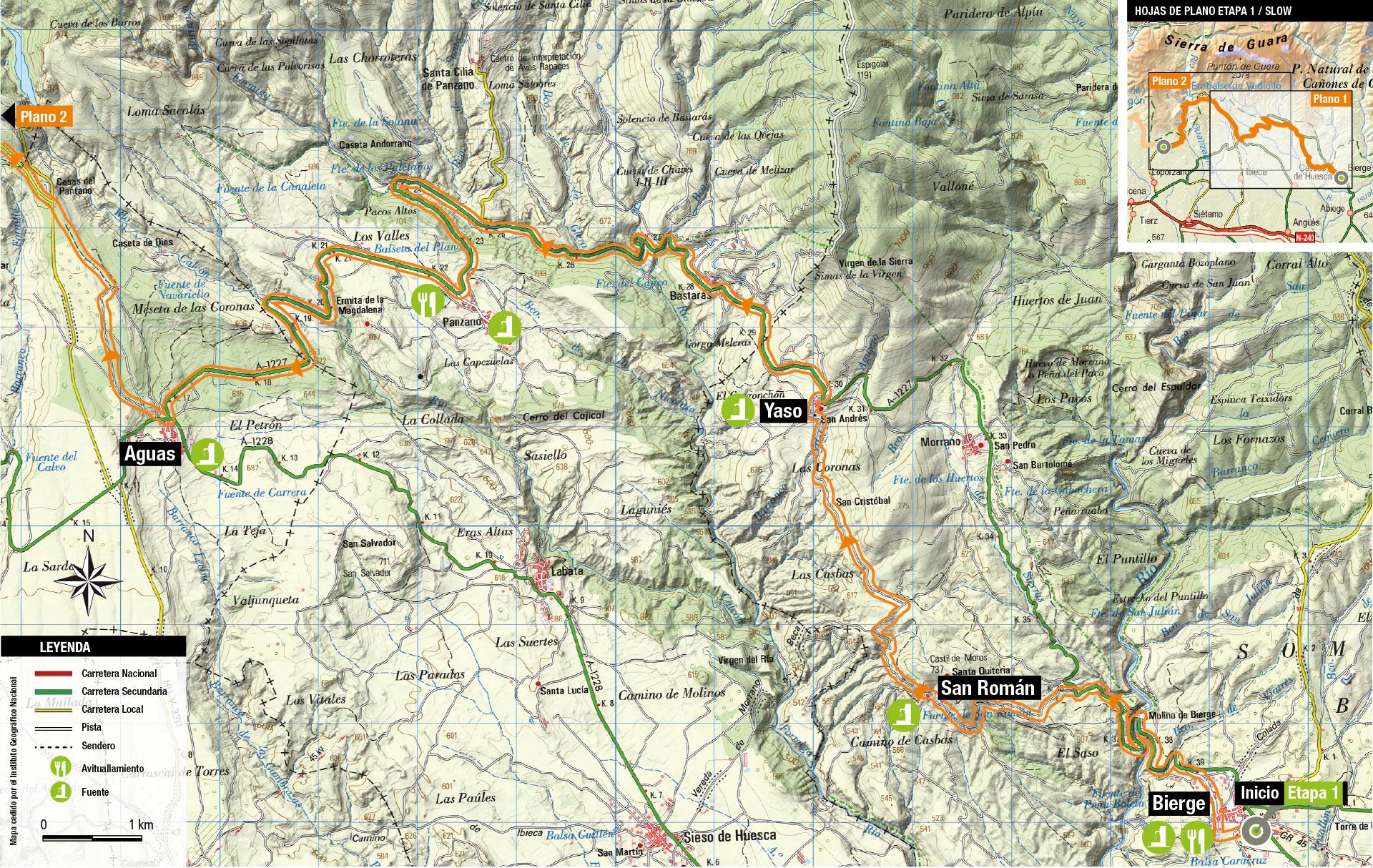 Nuestra ruta de la Prepireanica Slow Medieval se inicia junto a la Hostería de Guara, tomando el Sendero Histórico GR-1 que rodea el casco urbano de Bierge y pasa junto al molino para salir a la carretera. Tras un descenso, llegamos al primer punto de interés del día, el Salto de Bierge. Desde allí queda un remonte por asfalto hasta el pintoresco pueblo de San Román.